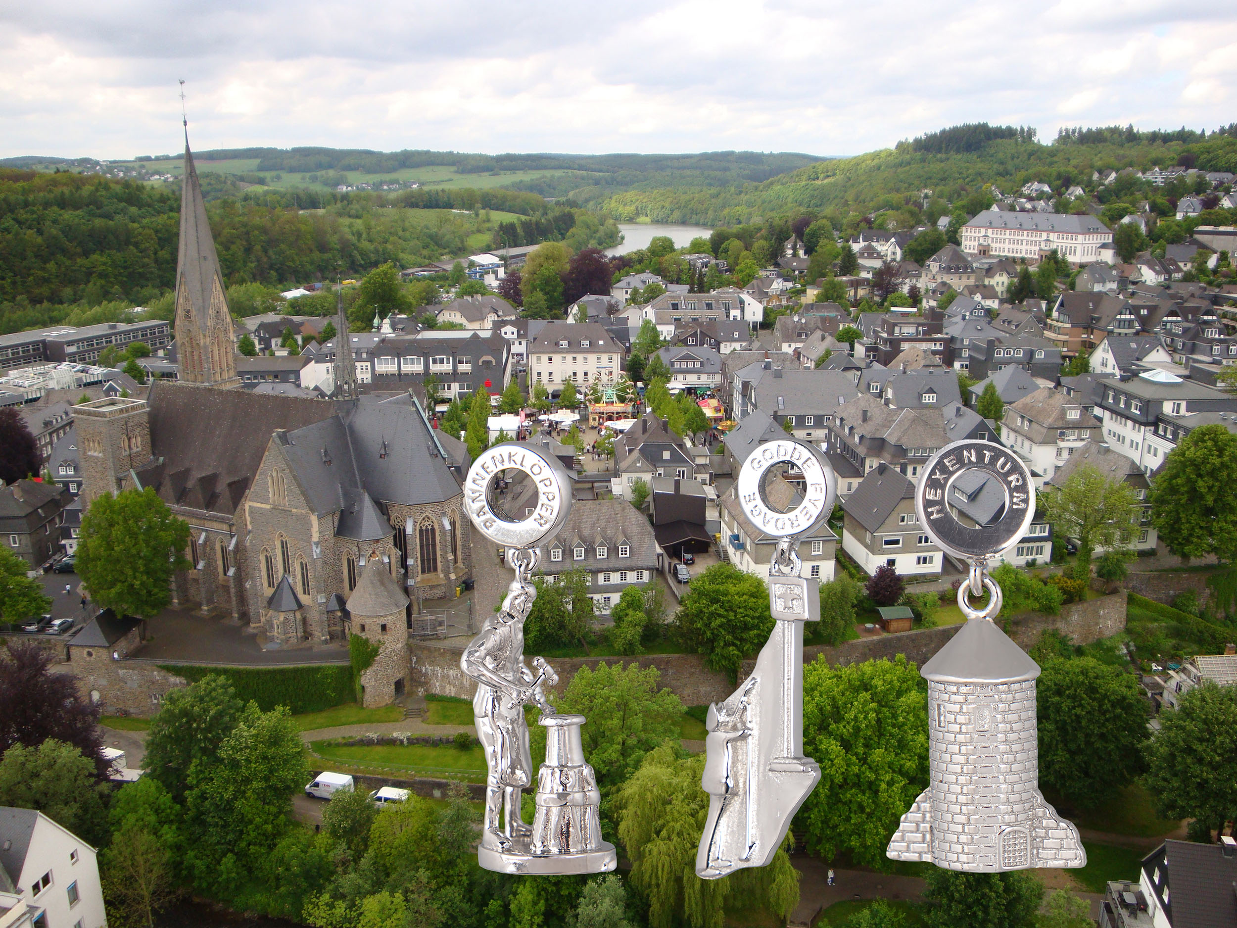 Diese Miniaturen von Wahrzeichen der Stadt Olpe Pannenklöpper, Hexenturm, und Vogelstange mit Schützen werden in 925er Sterlingsilber gefertigt.